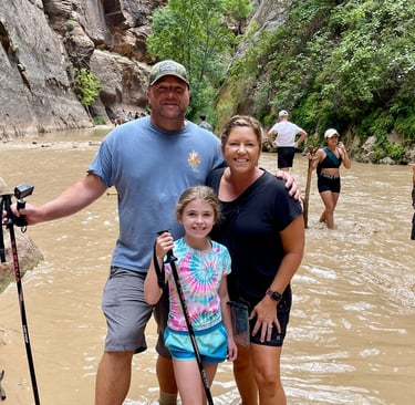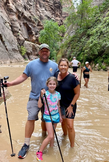 Hiking The Narrows at Zion National Park in August was an unforgettable adventure, filled with breathtaking scenery and unique challenges. To prepare for you trek, you'll want to equip yourselves with sturdy hiking sticks, essential tools that provide stability. If you've never used them, you'll thank us later! We were there after a big rain and so the water looked like chocolate milk. You weren't sure if you were stepping into 8 inches or 2 feet without using our hiking sticks to verify. As a mom, I'm thinking "please God don't let my kid drop down 2 feet because then she's soaking wet and the hike may or may not be done".